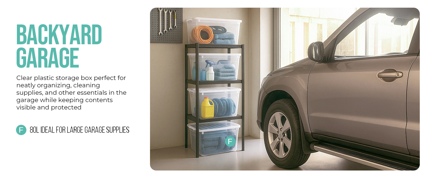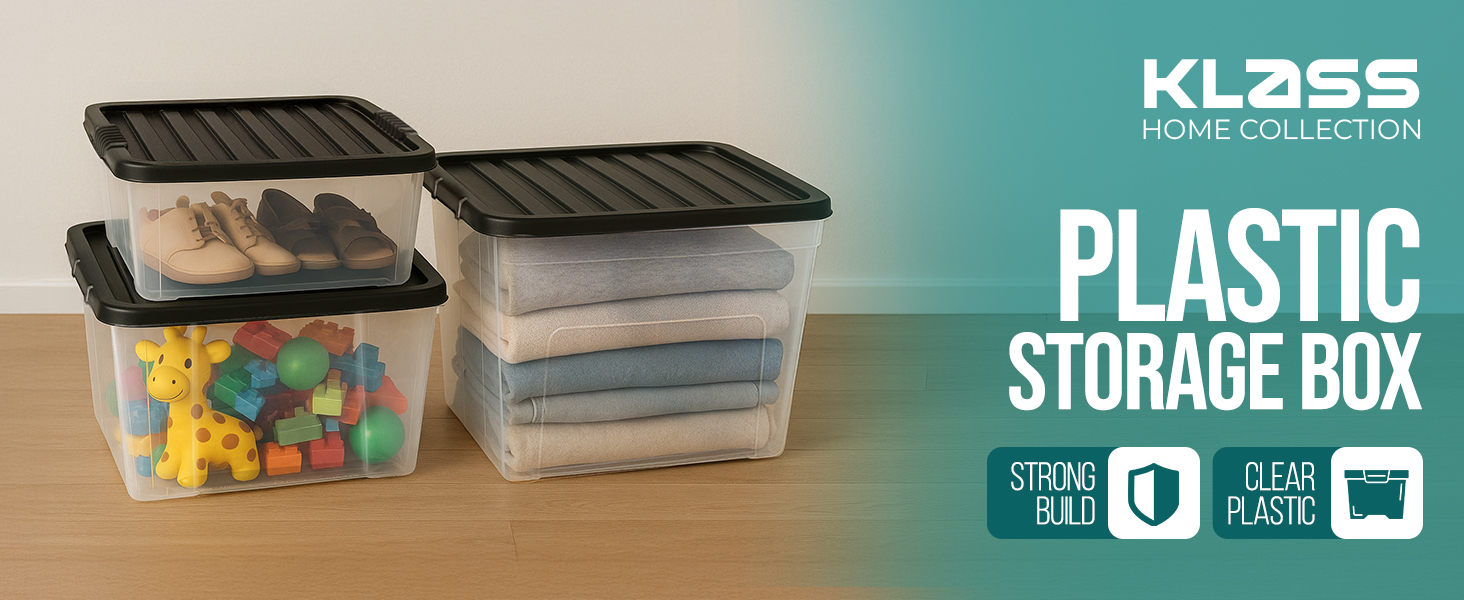 Durable, lidded containers in various sizes. Perfect for seasonal clothing, toys, or documents. They are stackable and can be placed on shelves within the cabinet for ultra-efficient organization.