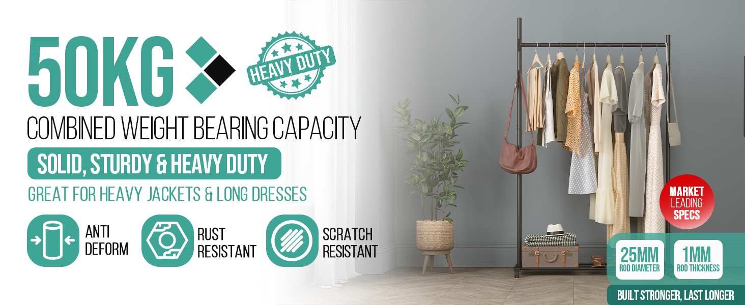 Klass Home Collection Portable Heavy Duty Clothes Rail For Bedroom, Home & Shops, 50KG Load Clothes Rack With Storage Shelf, Metal Clothing Rail For Hanging Garments, Coats (White With Wheels)