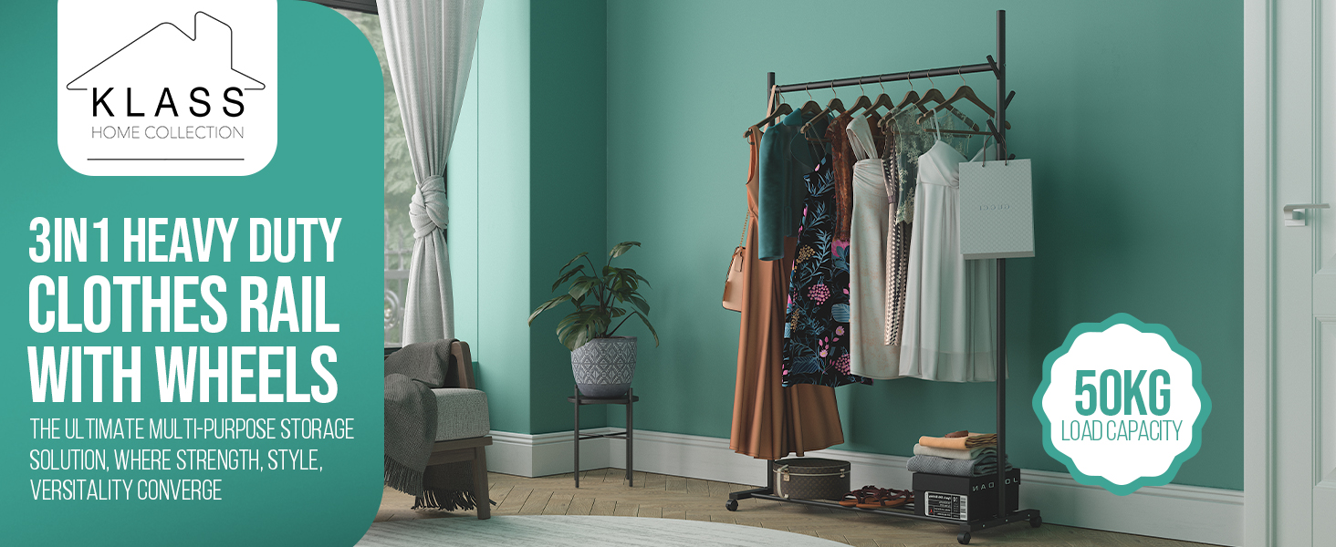 Klass Home Collection Portable Heavy Duty Clothes Rail For Bedroom, Home & Shops, 50KG Load Clothes Rack With Storage Shelf, Metal Clothing Rail For Hanging Garments, Coats (Black With Wheels)