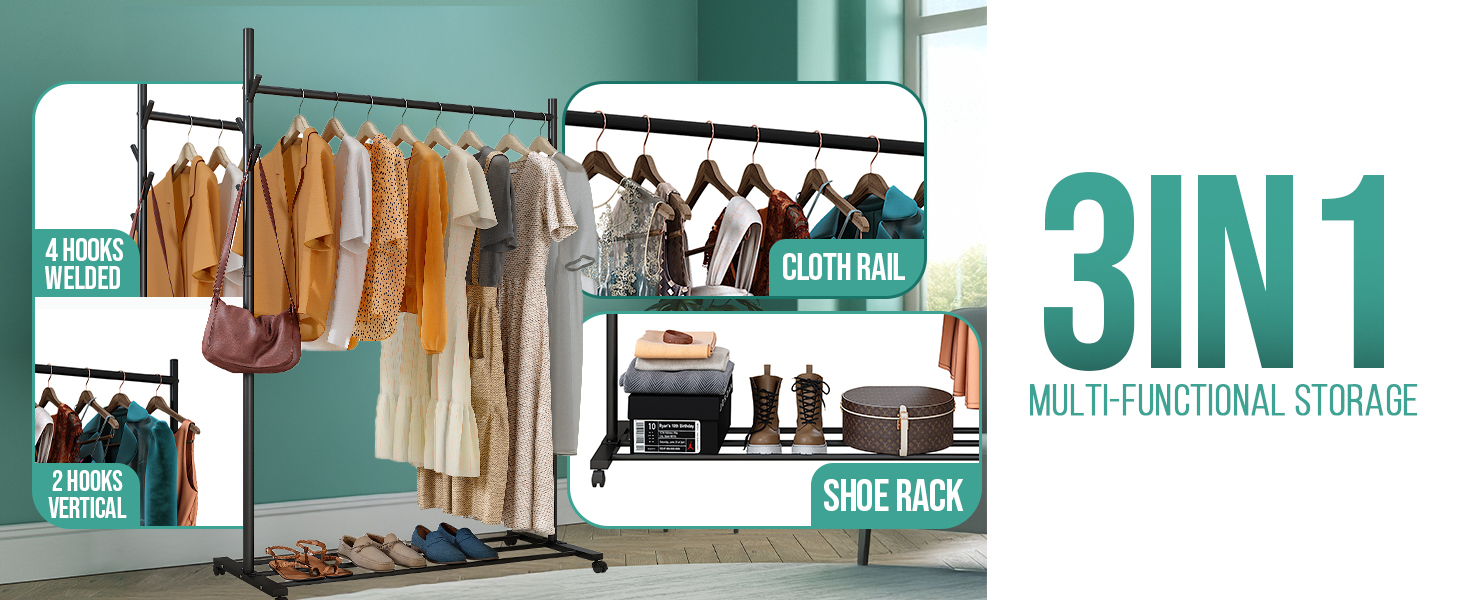 AMPLE STORAGE WITH BOTTOM SHELF & 4 HOOKS – The clothes stand has a deep sturdy 3-rod bottom shelf acting as a shoe rack or storage shelf for boxes or folded clothes. With 4 metal hooks on one side and 2 vertical rods which can be used as additional hooks, this free standing clothes rail provides ample storage.