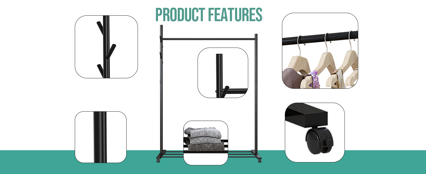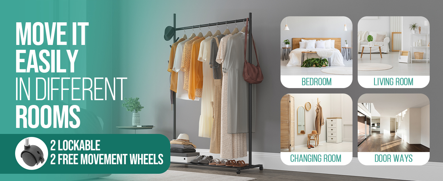 PORTABLE & EASY TO MOVE WITH LOCKABLE WHEELS – Easily reposition this portable clothes rail on wheels, featuring four 360° swivel casters, 2 of which are lockable. Ideal for anyone needing a mobile garment rail or dressing up rail, it ensures flexibility for both home and retail spaces.